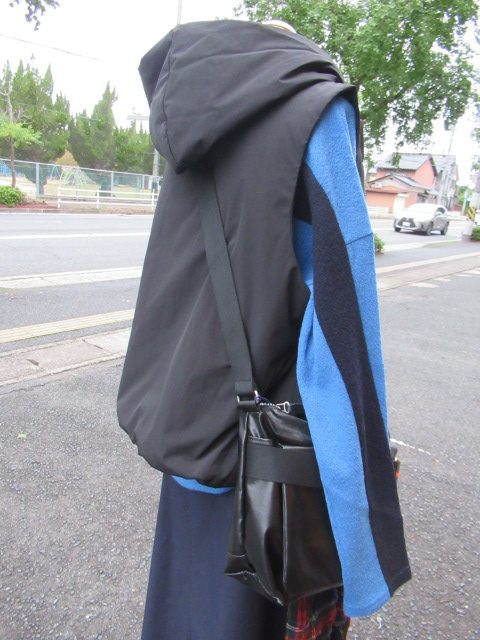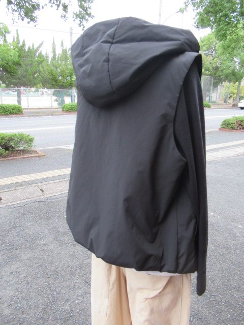 こちらは ブラックの中綿入りのフード付きベスト。