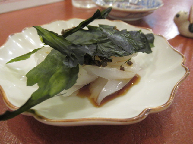 アオリイカに 山椒醤 & 板わかめをのせて。